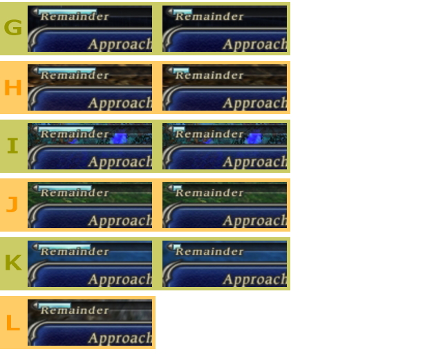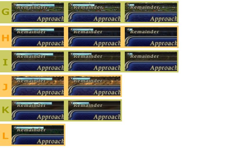 | ・Remainder減少パターン | 伐採作業するごとにRemainderゲージは減っていきますが、その減少量は収穫物とランクと獲得力によって変化します。 この減少量の変化を分類すると、どのRemainderタイプでも12パターンあります。 減少量が少ない順にパターンA〜Lと(勝手に)呼んでます。 |