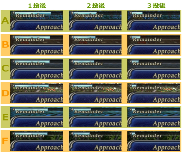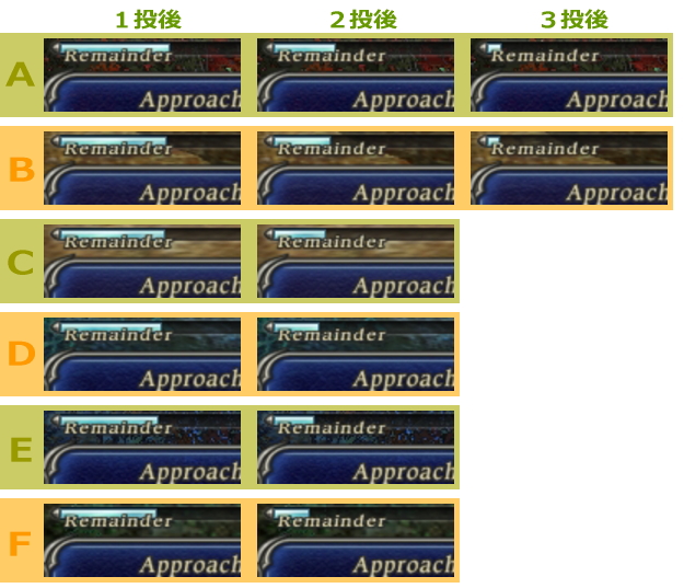| ・アタックチャンスバー | Remainderゲージのこと。アタックチャンスの元となった造語ですが、 公式でRemainderゲージとの記載があったので最近では廃れ気味。 |